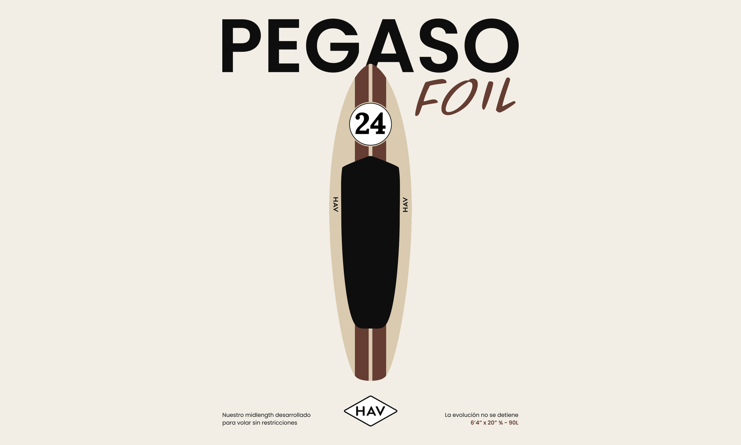 Disseny personalitzat de la tabla de foil PEGASO. Una evolució del shape midlength de HAV, pensada per volar sense restriccions. Aquesta versió ajustada per a parawing combina control, eficiència i una estètica inspirada en el món del motor. Forma, funció i velocitat en cada detall.